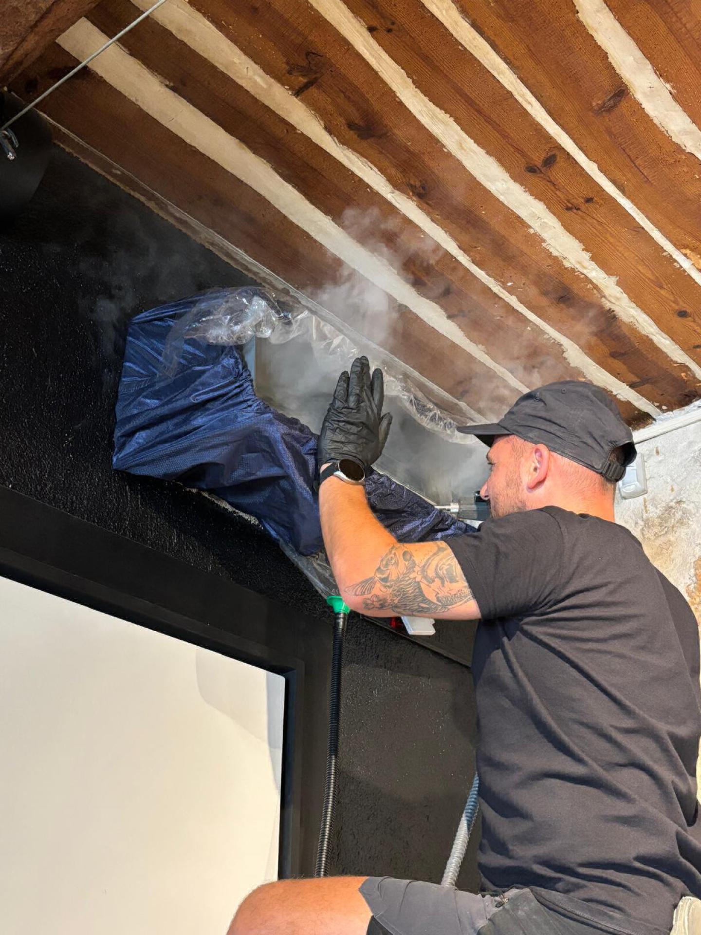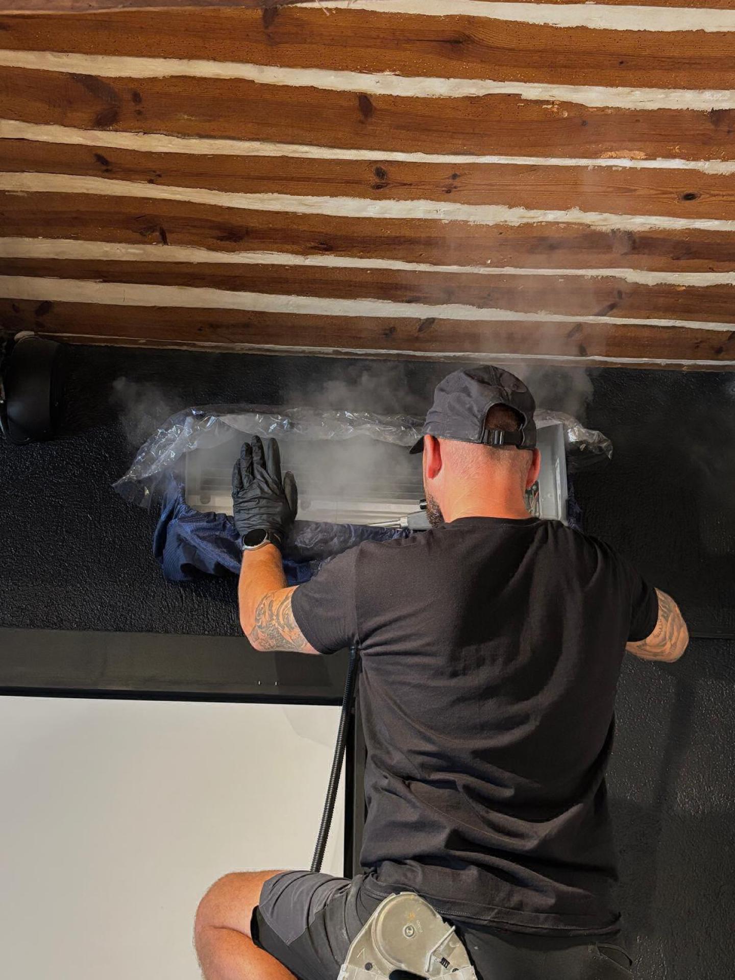 Sur les photos, notre technicien climatisation à Cannes effectue une désinfection complète à la vapeur, accompagnée de produits spécifiques, afin de garantir un air sain dans le local.